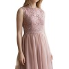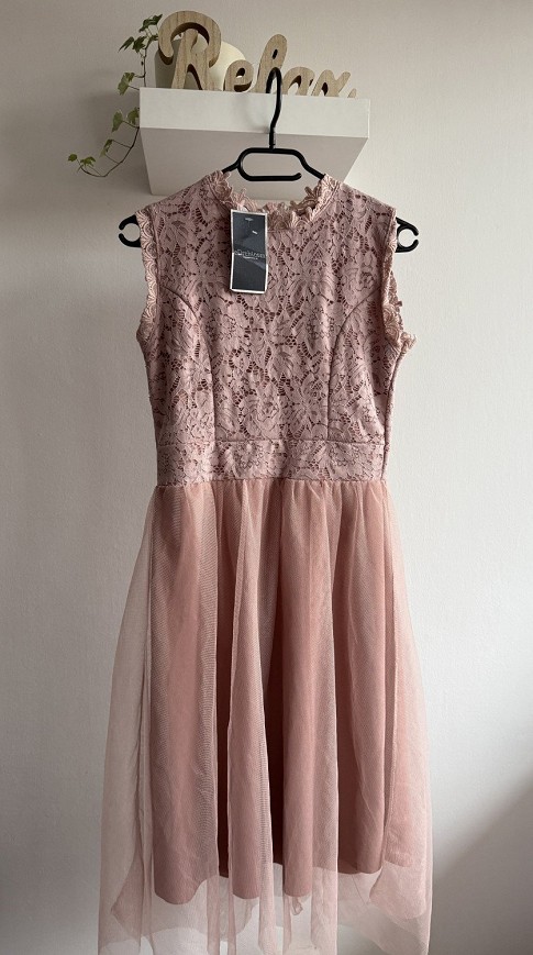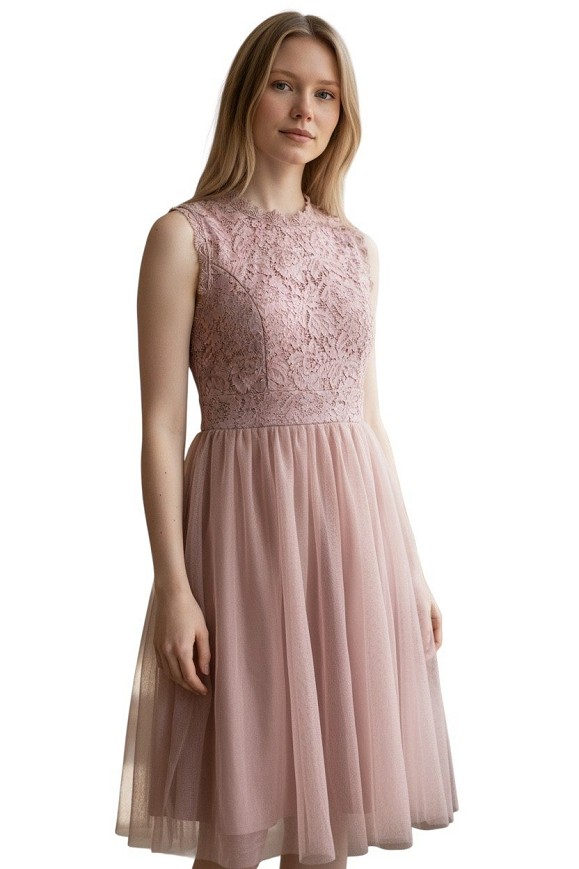 Gyönyörű, púderrózsaszín alkalmi ruha. Csipkés felsőrész és tüllös, lágy esésű szoknya teszi igazán elegánssá. Tökéletes választás ünnepségre, esküvőre vagy különleges alkalomra.