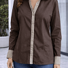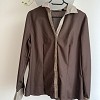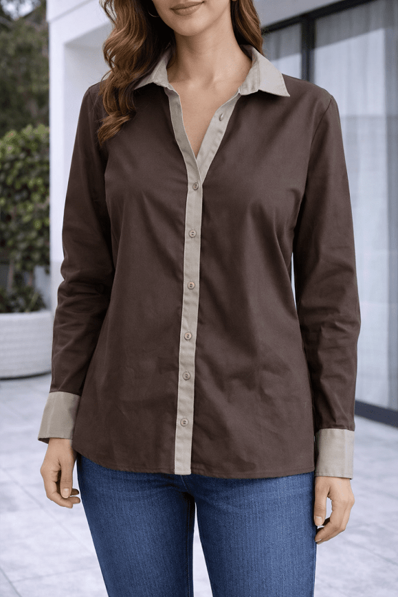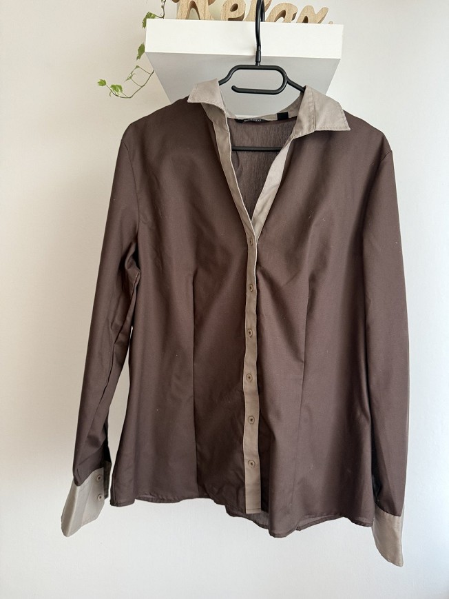 Elegáns barna ing kontrasztos bézs gallérral és mandzsettával. Letisztult szabása miatt tökéletes irodai vagy alkalmi viselethez is. Nadrággal és szoknyával kombinálva is kifinomult megjelenést ad.