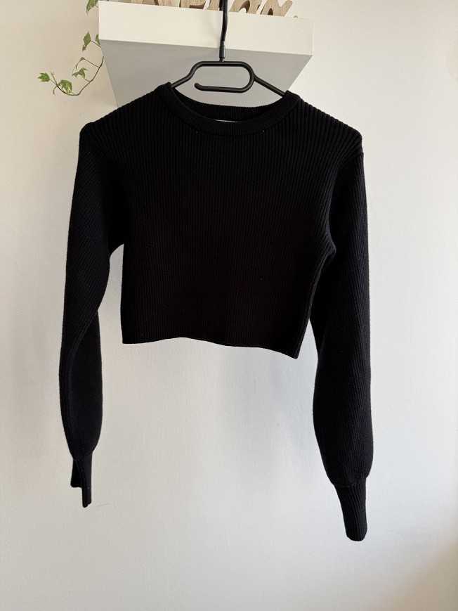 Letisztult, fekete kötött crop felső bordázott anyagból. Rövidített fazonja modern és trendi megjelenést ad, miközben a rugalmas anyag kényelmes viseletet biztosít.