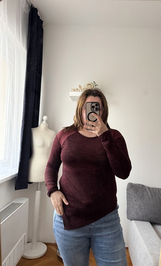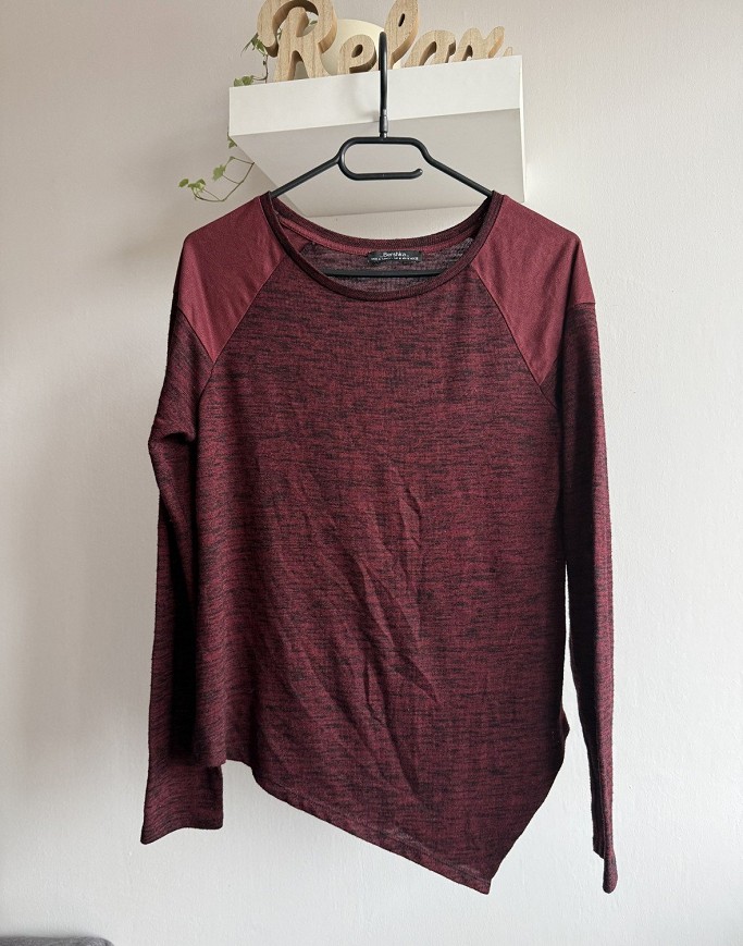 Bershka bordó, hosszú ujjú felső. Vállrészen díszbetéttel, alul enyhén aszimmetrikus fazonnal, ami különleges megjelenést ad. Kényelmes, hétköznapi darab farmerhez vagy leggingshez is tökéletes.