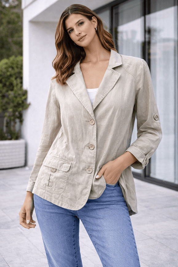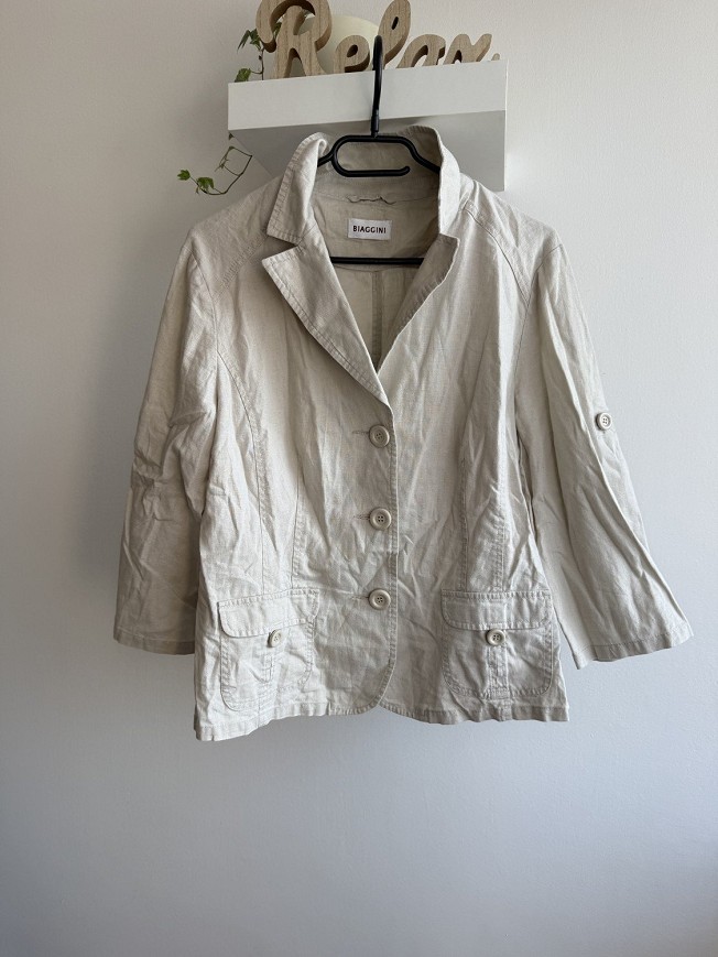 Világos bézs Biaggini női blézer. Gombos záródású, 3/4-es ujjú fazon, elöl zsebekkel. Könnyed, elegáns darab, amely jól kombinálható farmerrel vagy elegánsabb szettekhez is.