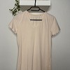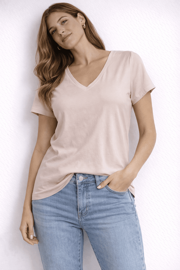 Letisztult, nőies szabású V-nyakú póló, világos bézs árnyalatban.