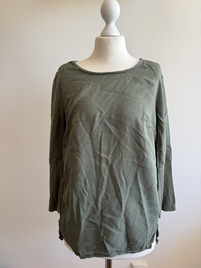Cecil olívazöld, hosszított fazonú női felső. Kényelmes, könnyed esésű anyagból készült, 3/4-es ujjal és kerek nyakkivágással. Az oldalán ráncolt részletekkel, amelyek csinosan formálják az alakot. Farmerrel vagy leggingsszel is jól kombinálható, hétköznapi, mégis nőies darab. Használt, szép állapotú, praktikus alapdarab a gardróbba.