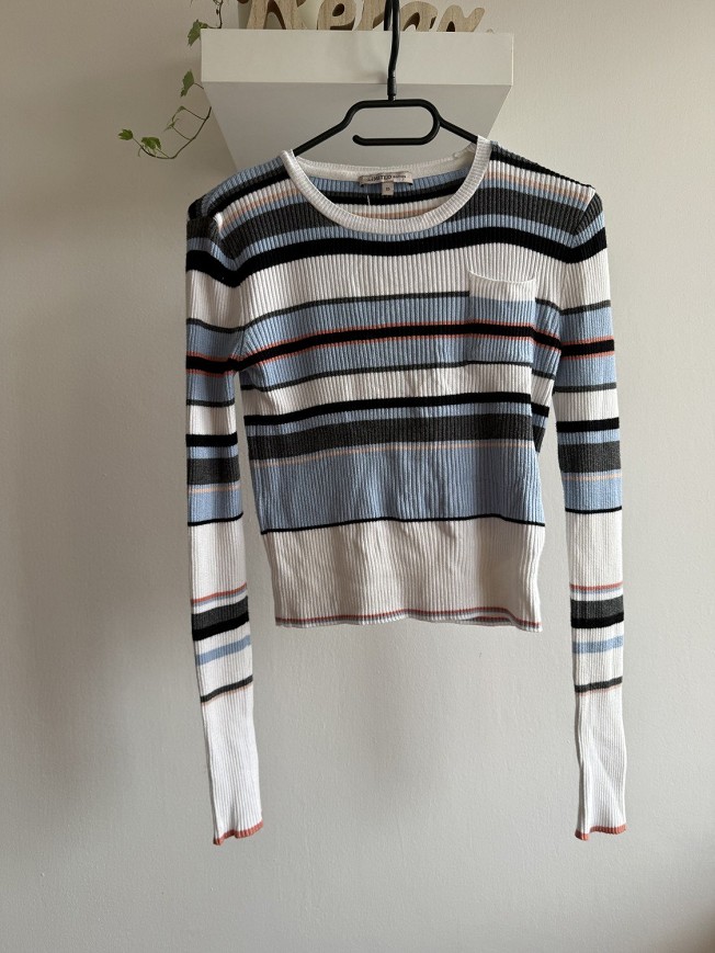 Csíkos, bordázott női crop felső modern, trendi fazonban. Rövidebb szabása és testhez simuló anyaga szépen kiemeli az alakot, a mellzseb pedig extra részletet ad neki. Tökéletes választás magas derekú farmerrel vagy szoknyával kombinálva.