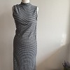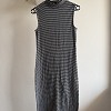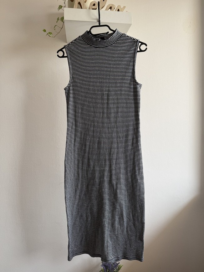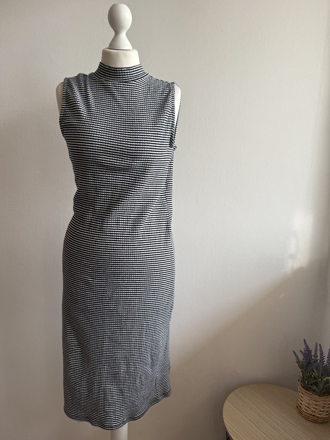 Kék-fehér aprómintás, ujjatlan midi ruha magasított nyakkal. Testhezálló, mégis kényelmes, rugalmas anyagú darab, amely szépen követi az alakot. Sportcipővel hétköznapi, szandállal vagy magassarkúval pedig nőiesebb szettként is tökéletes választás.