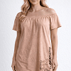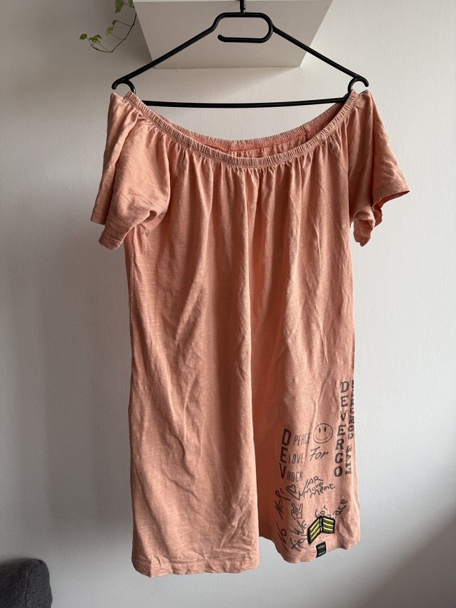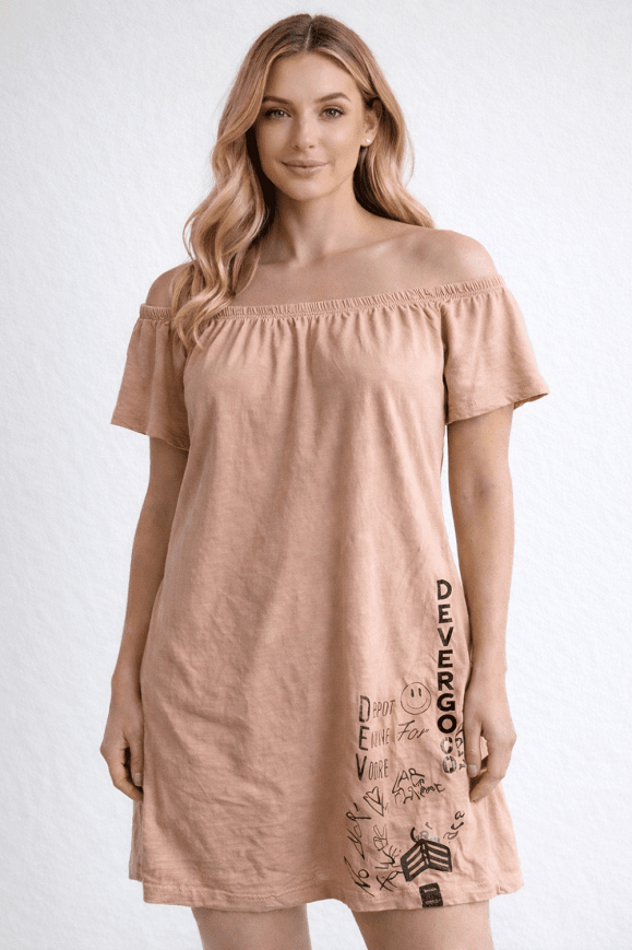 Barackos árnyalatú, vállra húzható Devergo ruha, rugalmas gumírozott nyakrésszel. Az alján egyedi, vagány feliratokkal és mintával díszített, ami igazán különlegessé teszi.