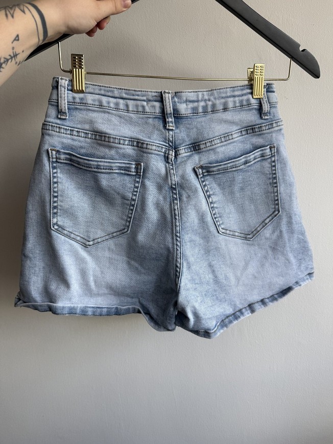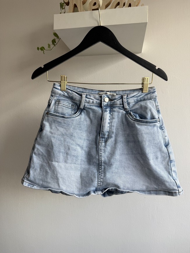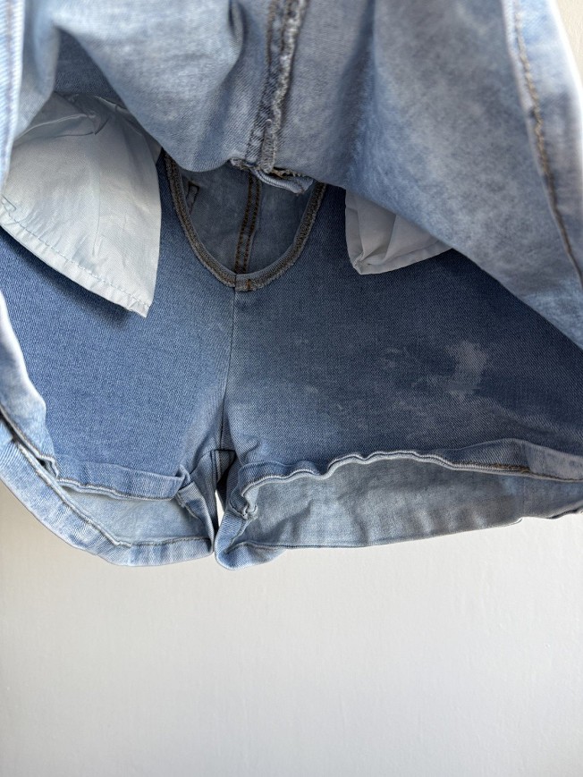 Trendi, világoskék farmer szoknya, amely belül rövidnadrágos kialakítású, így kényelmes és biztonságos viselet. Magas derekú fazon, klasszikus zsebekkel – tökéletes nyári darab pólóval, toppal vagy bodyval. ☀️