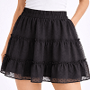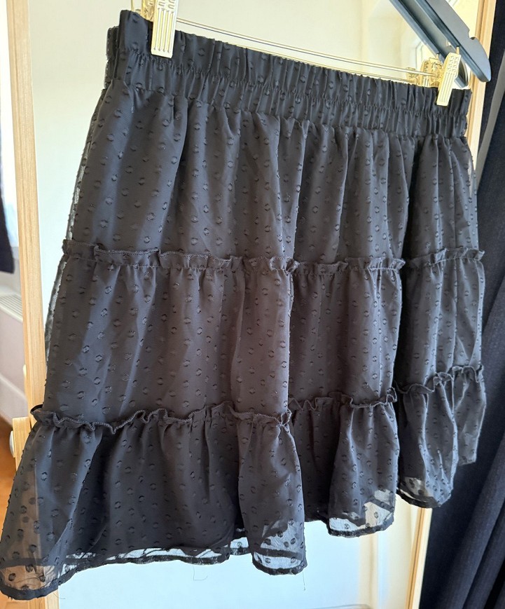 Csinos fekete szoknya könnyed, pöttyös textúrájú anyagból. Gumis derékrésszel, több rétegű fodros kialakítással, ami nagyon szép esést ad neki. Légies, nőies darab, ami hétköznapokra és alkalmakra is könnyen kombinálható.