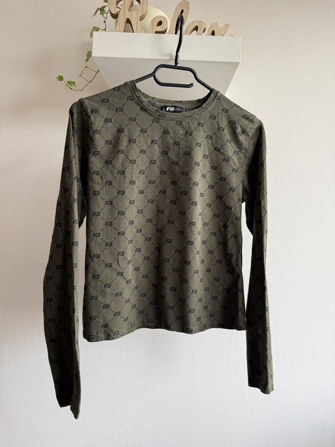 Khaki-zöld alapon fekete mintás, hosszú ujjú felső az FB Sister márkától. Testhezállóbb, mégis kényelmes fazonú darab, ami könnyen beilleszthető laza vagy akár sportosabb szettekbe is. Farmerrel, szoknyával vagy leggings-szel is jól mutat – igazán sokoldalú alapdarab.
