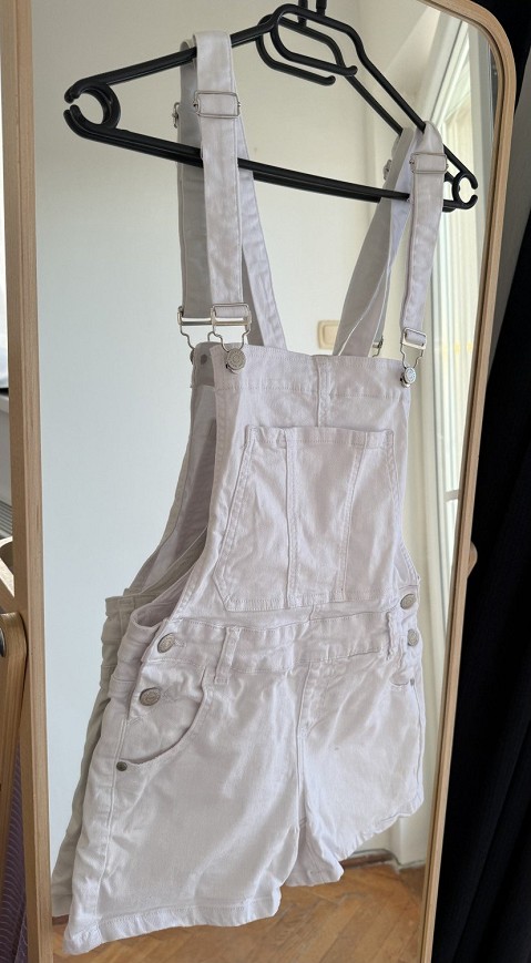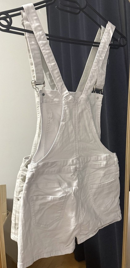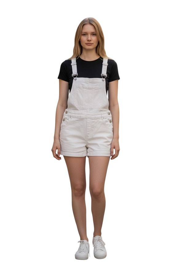 Stílusos fehér farmer kertésznadrág short fazonban. Állítható pántokkal, praktikus zsebekkel és klasszikus farmer részletekkel készült, ami kényelmes és divatos viselet a nyári napokra.