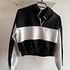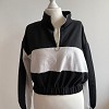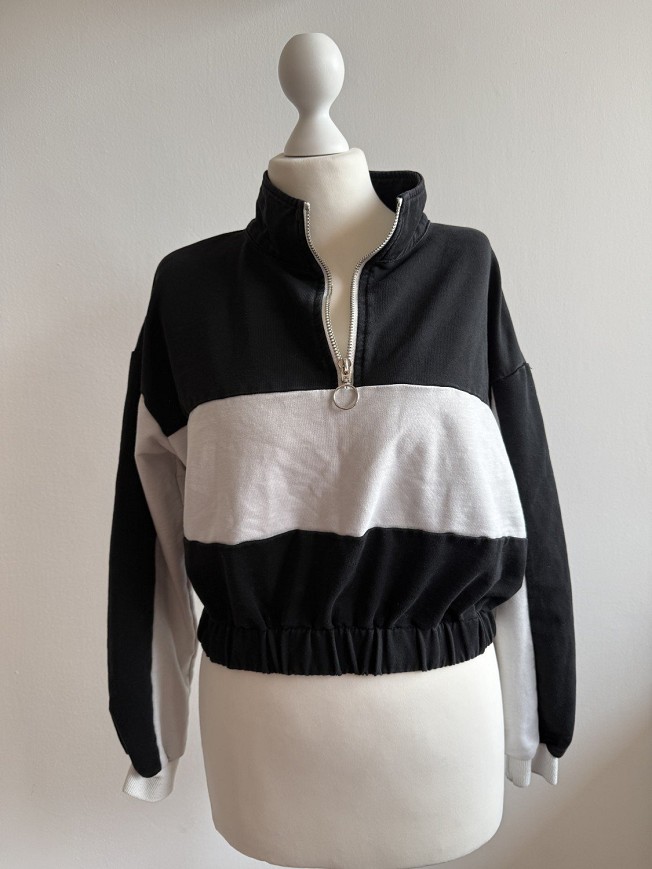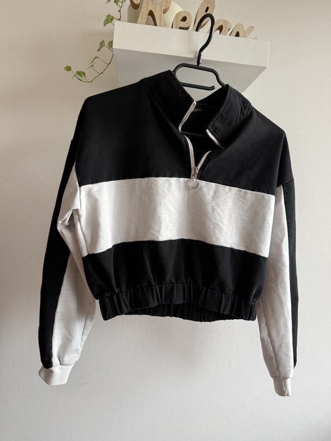 Fekete-fehér, rövid fazonú női pulóver sportos stílusban, cipzáras nyakkialakítással. Laza, kényelmes darab, amely tökéletes választás hétköznapi szettekhez. A fehér része fehérítésre szorul, ennek megfelelően került árazásra.
