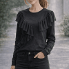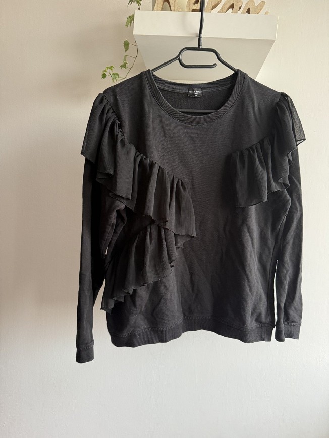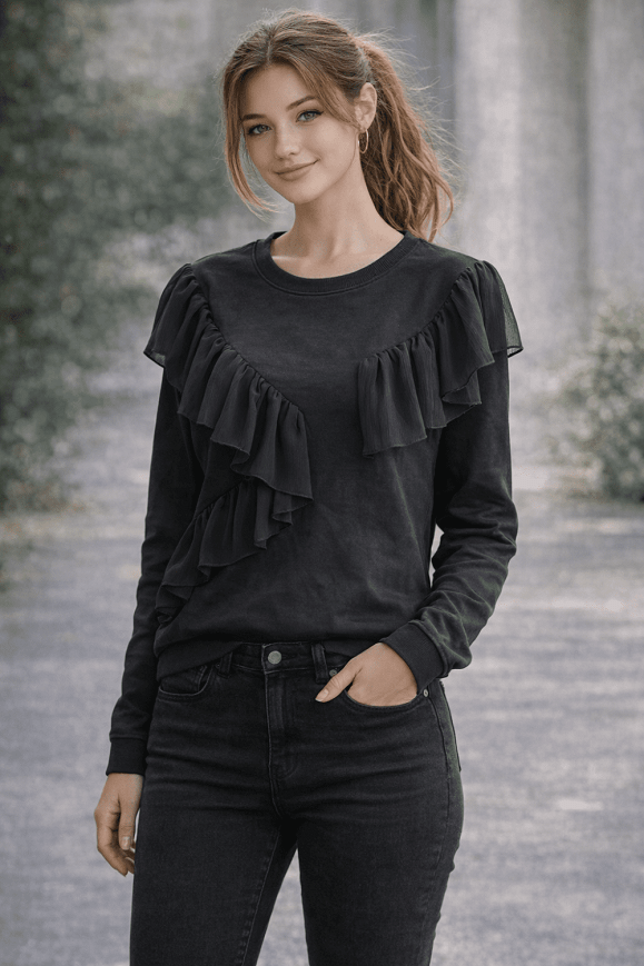 Egyedi, látványos fekete felső, különleges fodros díszítéssel az elején. Egyszerre elegáns és trendi darab, ami azonnal feldobja a legegyszerűbb szettet is. Kényelmes anyag, hosszú ujjú kialakítás.