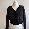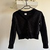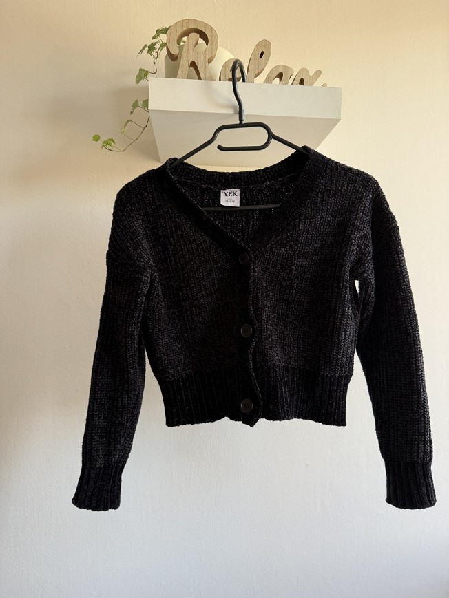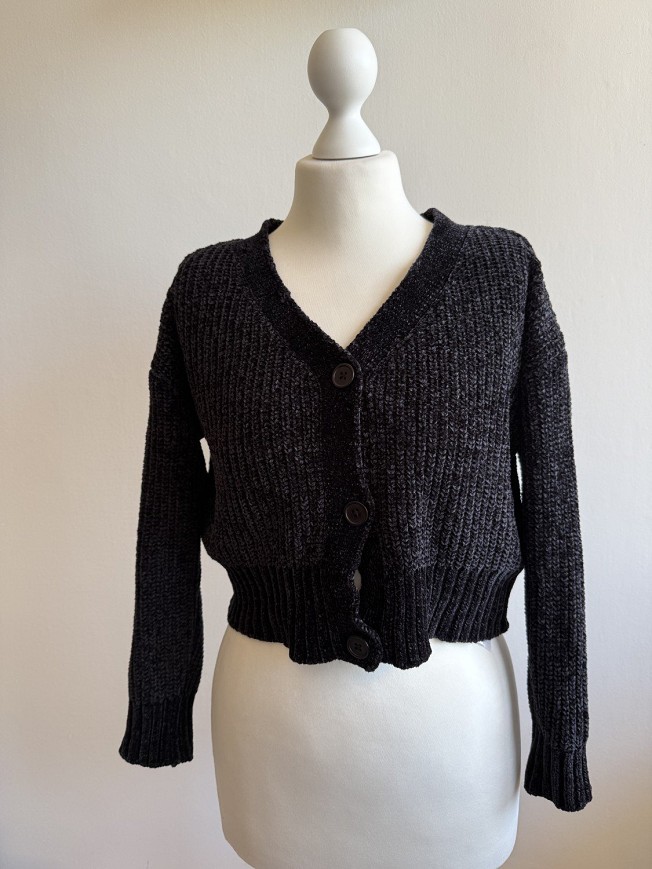 Fekete, rövidebb fazonú kötött kardigán gombos kialakítással. Vastagabb, strukturált kötésű anyagból készült, amely meleg és kényelmes viselet a hűvösebb napokra. Bordázott passzéval az alján és az ujjak végén, ami szépen tartja a formáját. Farmerrel, ruhára vagy magas derekú nadrággal is jól kombinálható. Használt, szép állapotú darab, csinos és praktikus rétegezős alapdarab a gardróbba.