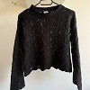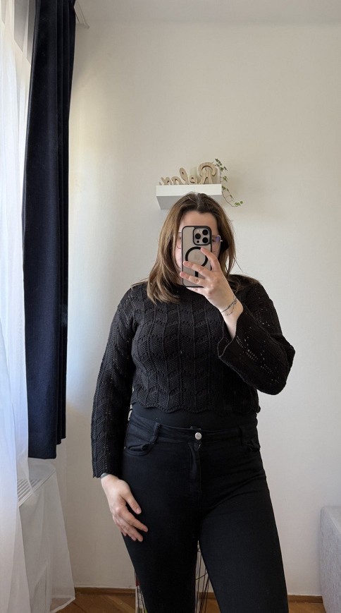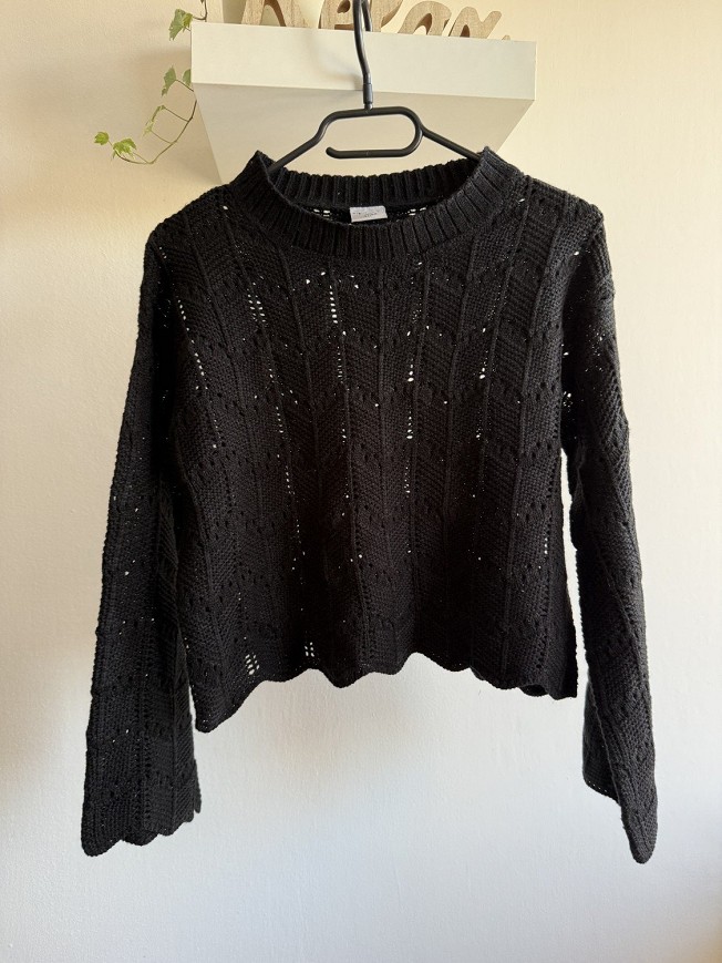 Fekete, rövidebb fazonú kötött pulóver különleges, áttört mintázattal. Laza szabású, enyhén bővülő ujjakkal, ami nőies és trendi megjelenést ad. Könnyedebb kötésű darab, így tökéletes átmeneti időszakra vagy rétegezéshez. Farmerrel vagy magas derekú nadrággal igazán jól mutat. Használt, szép állapotú felső, stílusos alapdarab a gardróbba.
