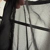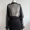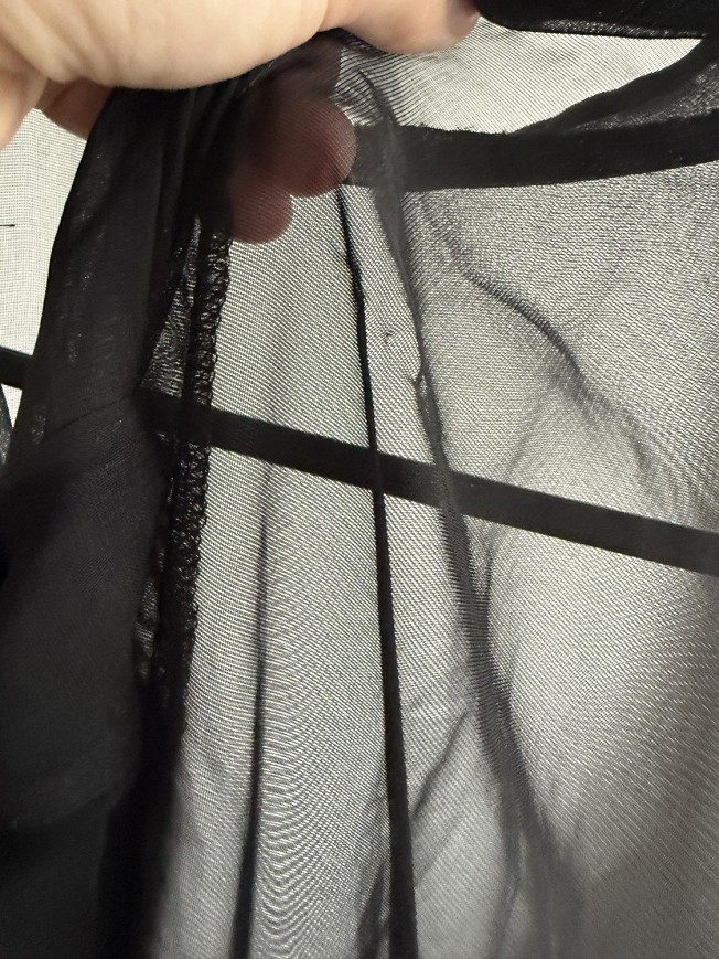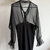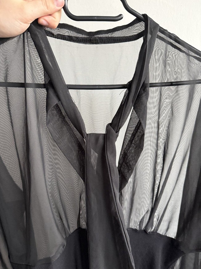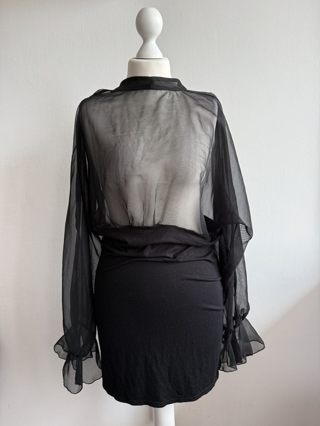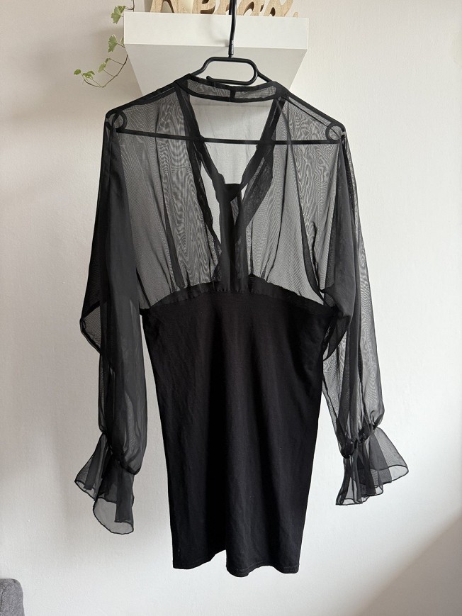 Fekete, áttetsző felsőrészű ruha, elegáns és különleges darab. A könnyed tüll ujjak és a nőies szabás igazán figyelemfelkeltővé teszik alkalmakra is. Apró szálhúzás hibája van.