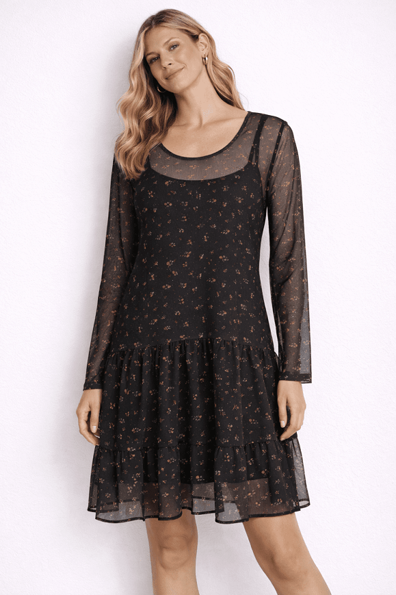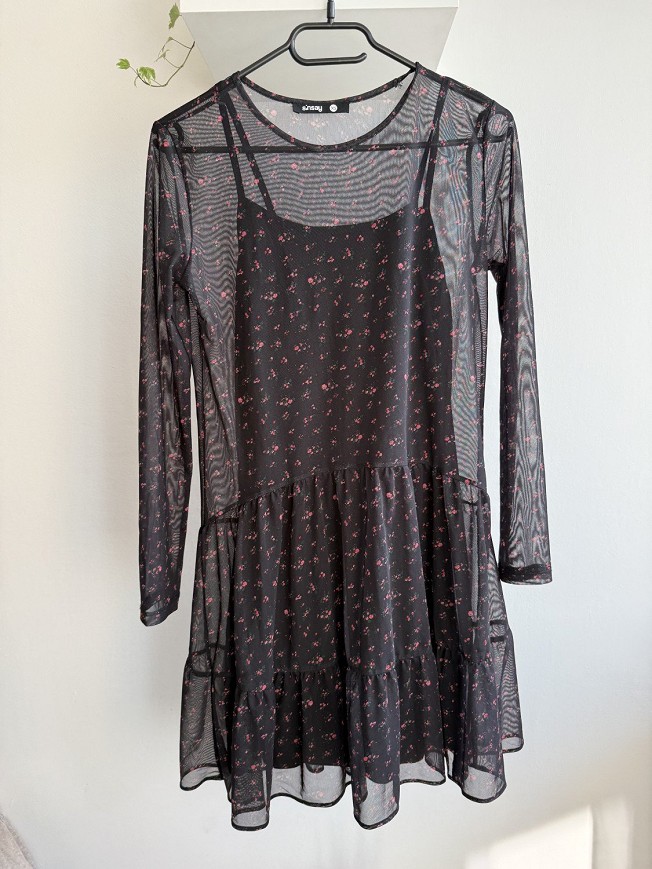 Különleges megjelenésű darab finom virágmintával és lenge, réteges szoknyarésszel. Nőies és könnyed ruha, amely alkalmakra vagy hétköznapi viseletre is tökéletes.
