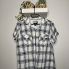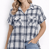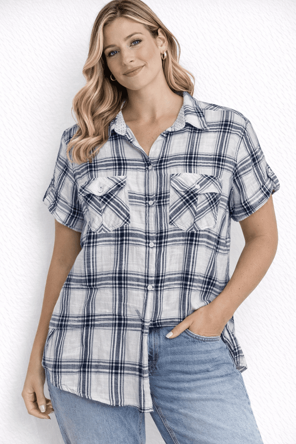 Klasszikus fehér–kék kockás mintájú, rövid ujjú ing.