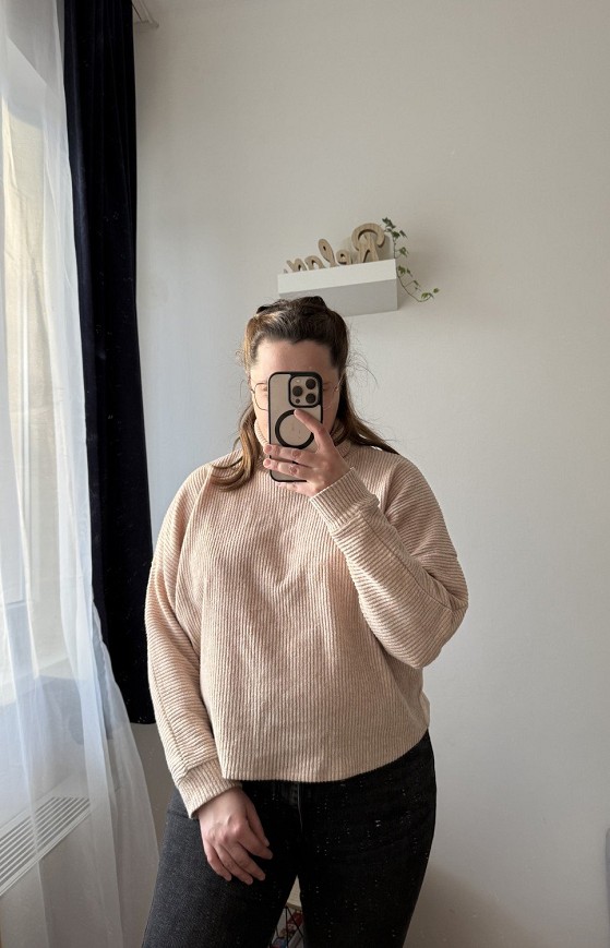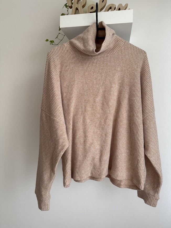 Puha tapintású, bézs garbós pulóver bordázott anyagból. Letisztult fazonja miatt igazi alapdarab, amely farmerrel és elegánsabb nadrággal is jól mutat. Kényelmes, meleg választás a hűvösebb napokra.