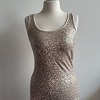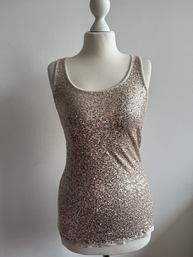 Krém árnyalatú, flitterekkel gazdagon díszített női felső, amely igazán látványos darab alkalmakra vagy egy csinos esti szetthez. Rugalmas anyagának köszönhetően kényelmes viselet, mégis elegáns hatást kelt. Farmerrel és szoknyával is remekül kombinálható.