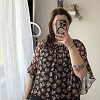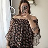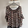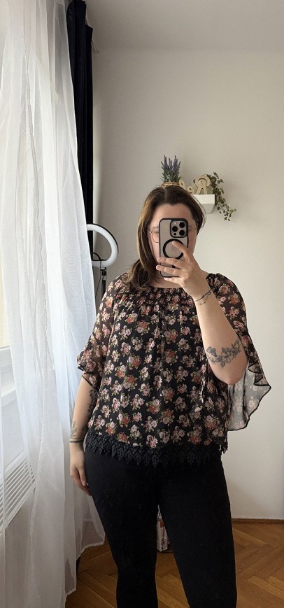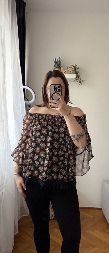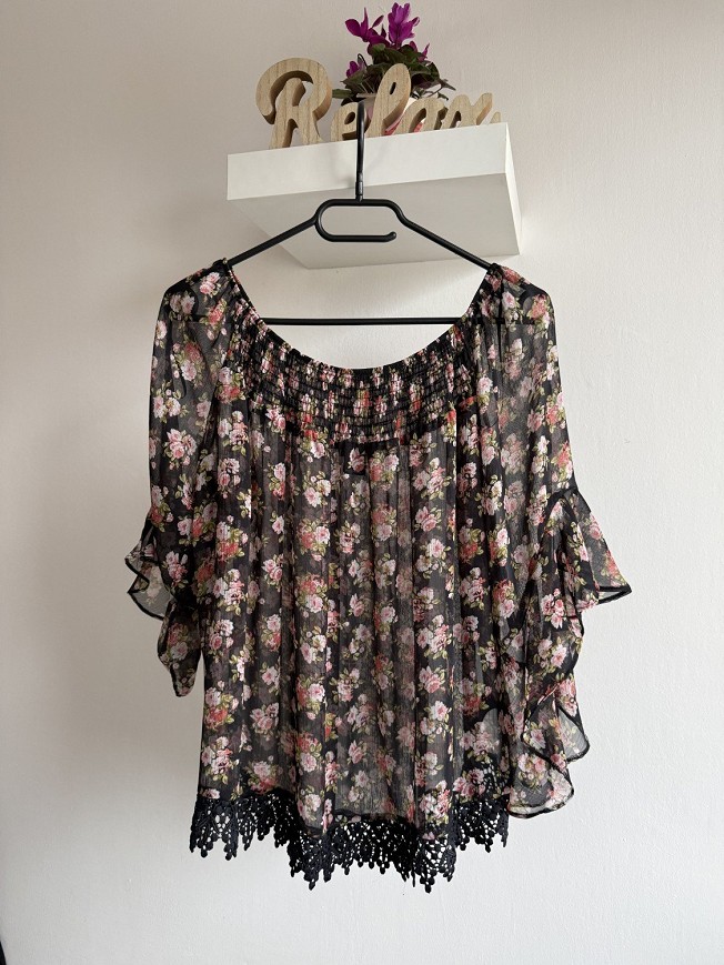 Fekete alapon apró virágmintás, könnyed, enyhén áttetsző anyagú felső. Gumírozott nyakrészének köszönhetően vállra húzva vagy ejtett vállal is hordható. Fodros ujjai és csipkés alsó szegélye nőies, romantikus hatást ad. Szoknyával és farmerrel is szépen kombinálható.