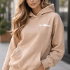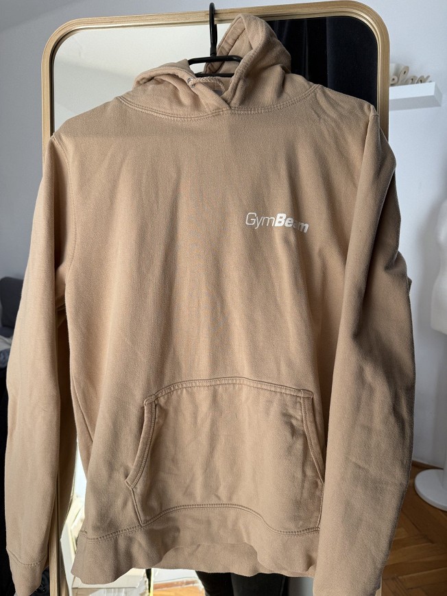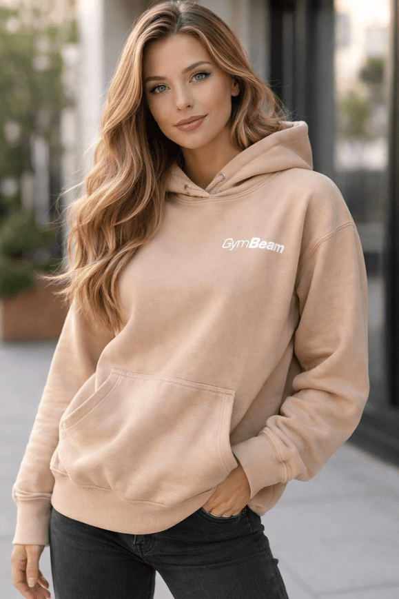 Bézs/nude színű, letisztult stílusú kapucnis pulóver, elején diszkrét GymBeam felirattal. Kényelmes, puha anyag, elöl kenguruzsebbel – tökéletes hétköznapi viselethez vagy sportos szettekhez.