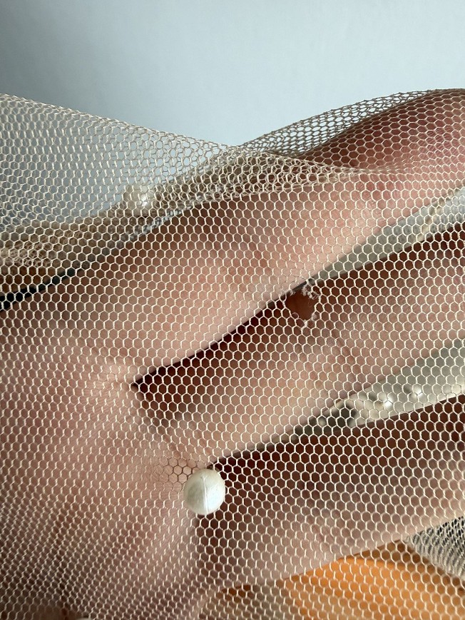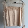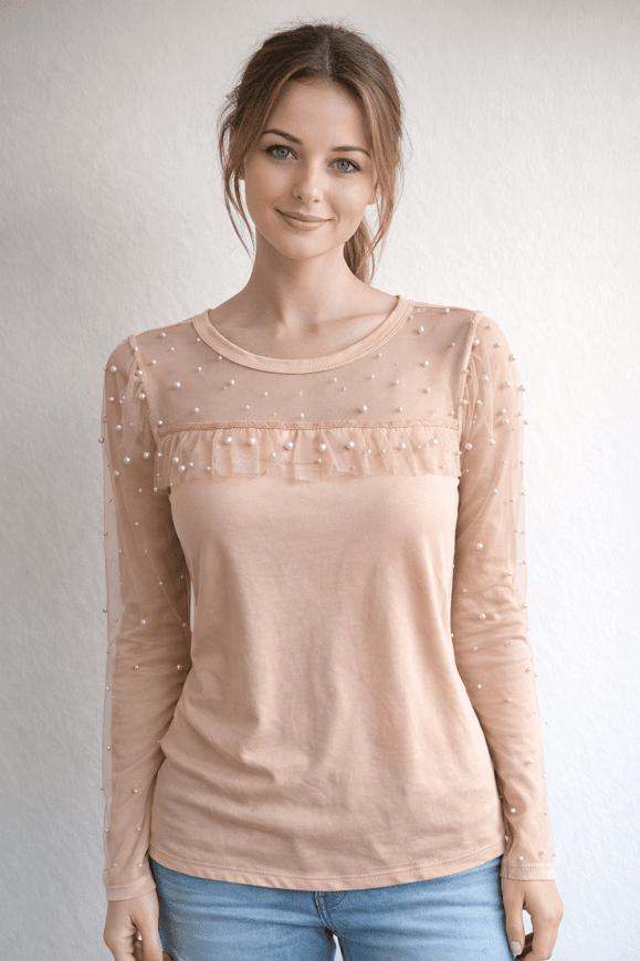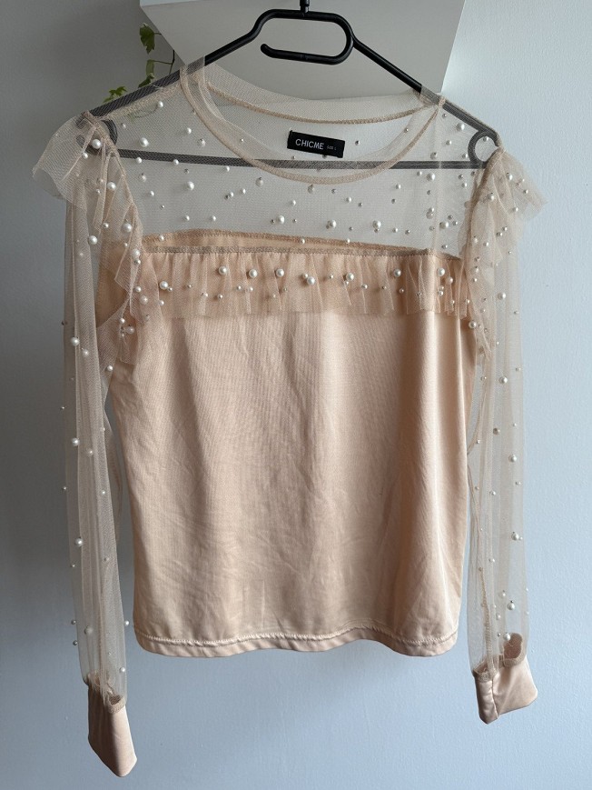 Igazán különleges, elegáns felső finom nude árnyalatban. A tüll rétegen elhelyezett gyöngy díszítés és fodros rész nőies, alkalmi hangulatot ad, miközben a belső rész kényelmes viseletet biztosít. Tökéletes egy csinosabb eseményre vagy ha feldobnád a hétköznapi szetted.Egy helyen a gyöngy lejött, és kiszakította a tüll anyagot.