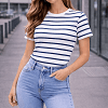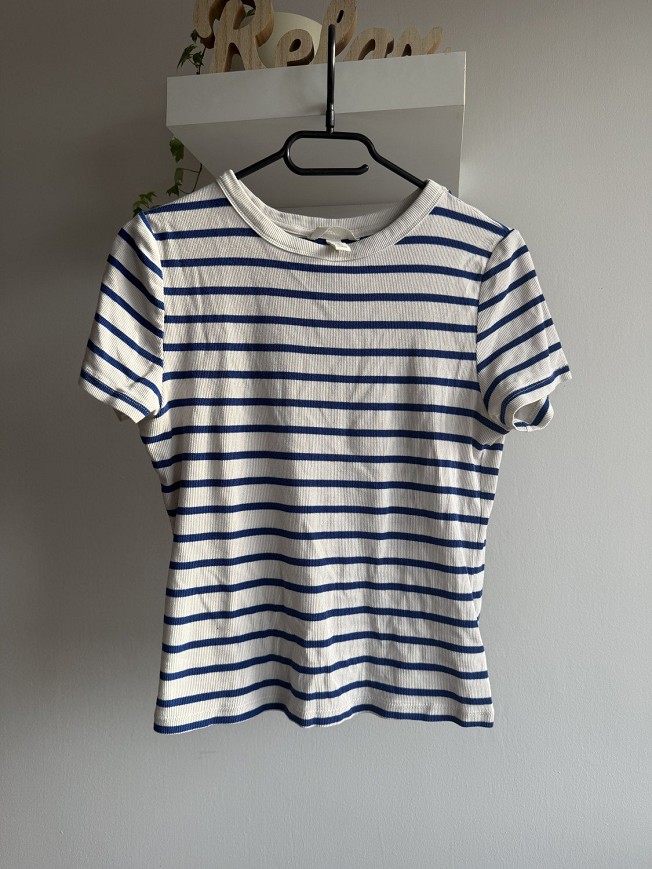 Klasszikus, mégis trendi darab kék-fehér csíkokkal. Testhezálló fazon, rugalmas anyaggal, ami kényelmes és jól áll. Tökéletes alapdarab farmerhez vagy szoknyához.