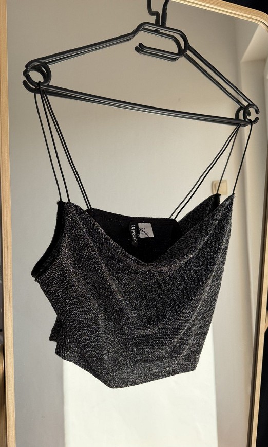 Fekete, csillogó anyagú crop top vékony pántokkal. Különleges, hátul keresztpántos kialakítású darab, ami igazán feltűnő megjelenést ad. Tökéletes választás bulira vagy alkalmi szettekhez.