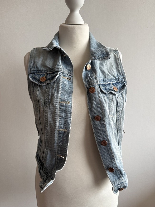 Világoskék, gombos lezárású farmer mellény a H&M-től, klasszikus dzseki fazonnal zsebekkel és gallérral. Laza, aláöltözhető darab, ami bármilyen szetthez ad egy vagány, casual stílust. Tökéletes választás átmeneti időszakra vagy réteges outfitekhez.