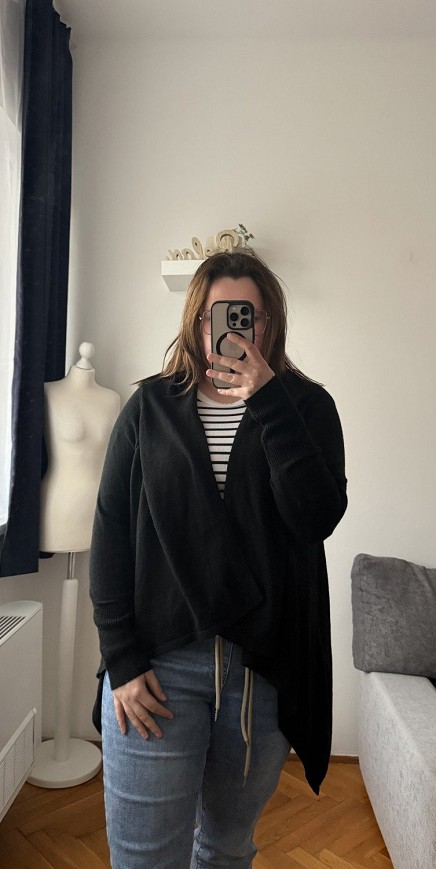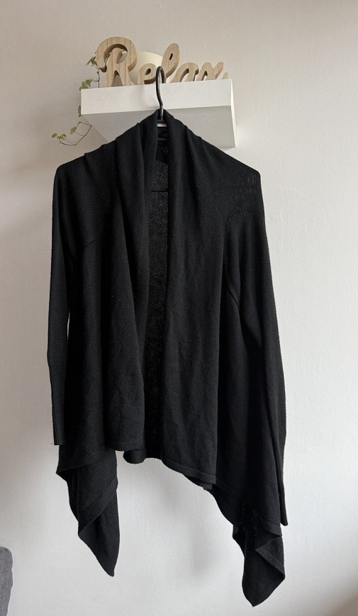 Fekete H&M kardigán, ami minden ruhatár alapdarabja. Lágy esésű, nyitott fazonja szépen rétegezhető, így elegánsabb és hétköznapi szettekhez is tökéletes választás.