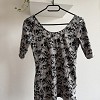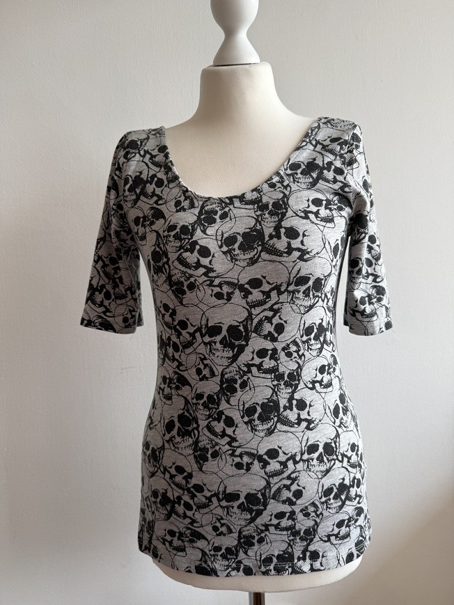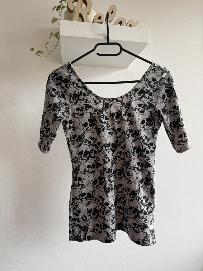 H&M koponyamintás női felső különleges, vagány stílusban. Testhez simuló fazonja és háromnegyedes ujja nőies, mégis karakteres megjelenést ad. Tökéletes választás farmerrel vagy bőrdzsekivel kombinálva.