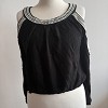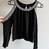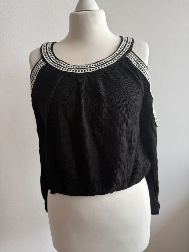 Fekete, különleges kivágású női felső dekoratív, fehér díszítéssel a nyakrész és váll vonalán. Laza esésű, könnyed anyaga kényelmes viselet, mégis igazán csinos és figyelemfelkeltő darab. Farmerrel vagy elegáns nadrággal is szuper választás egy esti programhoz vagy alkalomra.