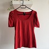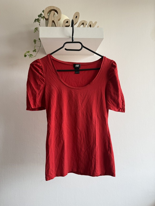 Csinos, nőies szabású H&M felső, enyhén puffos ujjakkal, ami különlegessé teszi az egyszerű darabokat is. Élénk piros színe igazi feltűnő, mégis könnyen kombinálható alapdarab. Kényelmes, rugalmas anyag, testhez simuló fazon.