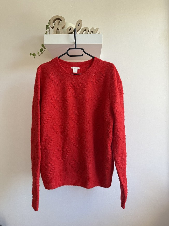 Élénk piros, puha tapintású H&M pulóver, különleges, enyhén texturált mintával. Kényelmes, meleg darab a hűvösebb napokra, ami farmerrel vagy fekete nadrággal is igazán mutatós.