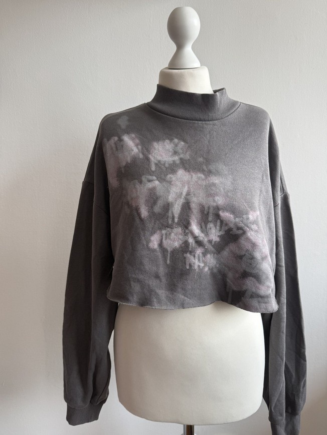 Szürke, rövidített fazonú H&M pulóver hosszú ujjakkal és finom nyakpánttal. Laza, kényelmes darab sportos-casual stílusban, elején halvány mintával / felirattal, ami egyedi karaktert ad neki. Tökéletes választás hétköznapi, laza outfitekhez farmerrel vagy leggings-szel.
