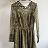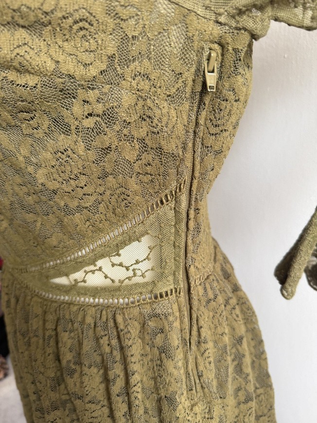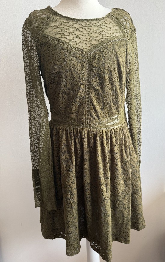 Elegáns, olívazöld csipkeruha hosszú ujjú, áttetsző csipkés felsőrésszel és bővebb, fodros szoknyarésszel. Nőies szabású darab, amely kifinomult megjelenést kölcsönöz – tökéletes választás estéhez, alkalomhoz vagy romantikus programhoz. A finom csipkedíszítés és a derékrésznél formált vonalak igazán elegánssá teszik ezt a H&M ruhát.