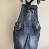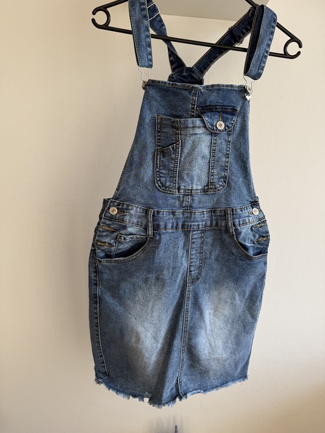 Divatos, középkék farmer kantáros ruha, amely tökéletes választás a hétköznapi, laza outfitekhez. Klasszikus farmer anyagból készült, állítható pántokkal, így kényelmesen a testre igazítható.