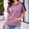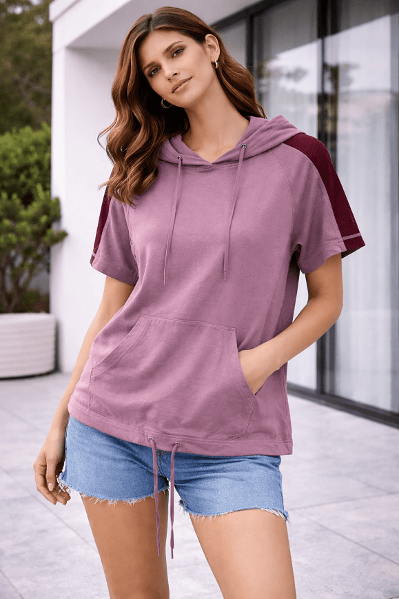 Kapucnis, rövid ujjú női felső laza, kényelmes fazonnal és praktikus elejtett zsebbel elöl. A kellemes, színes anyag trendi, mégis hétköznapi viselet, tökéletes a hűvösebb nyári napokra vagy átmeneti időszakokra. Farmerrel, leggings-szel vagy shorttal is könnyen variálható, sportos-laza szett alapdarabja.