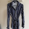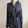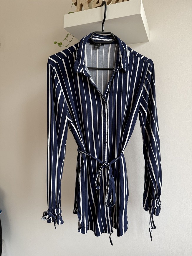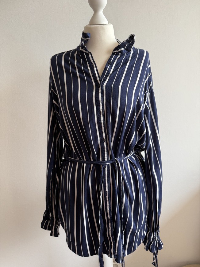 Sötétkék-fehér csíkos, ing fazonú női ruha megkötős derékkal. Karcsúsított szabása és állítható öve szépen kiemeli az alakot, miközben kényelmes viselet marad. Tökéletes választás irodába vagy egy csinosabb hétköznapi szetthez.