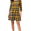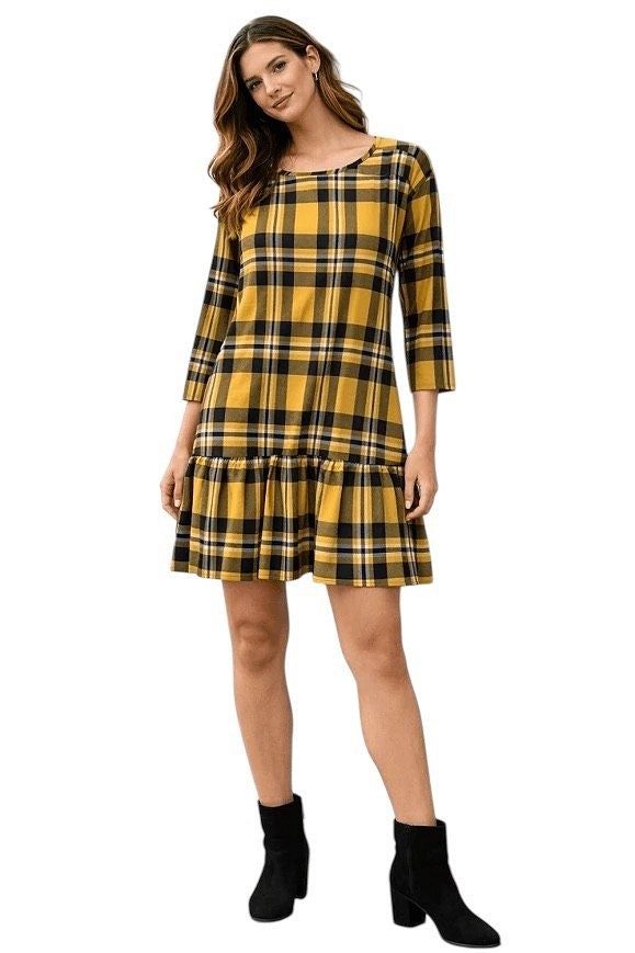 Sárga-fekete kockás mintájú, hosszú ujjú ruha, deréknál enyhén szabott, alul bővülő fazonnal.
