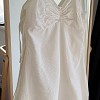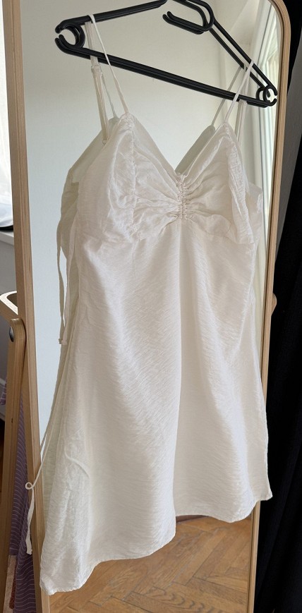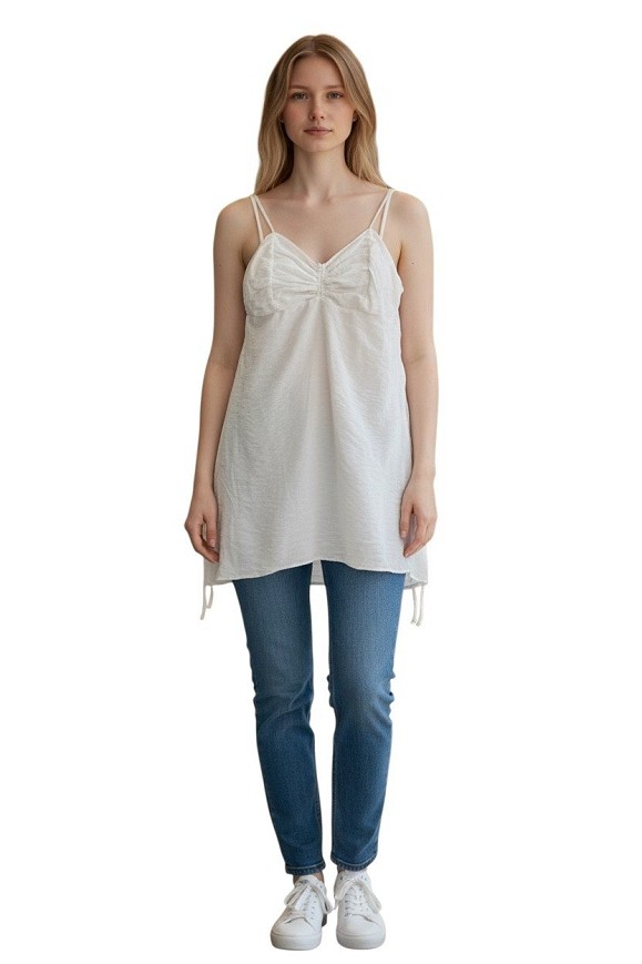 Letisztult, krém színű pántos felső/ruha nőies ráncolt mellrésszel. A könnyed, lágy esésű anyag és a vékony pántok igazán elegáns, nyári megjelenést adnak.