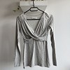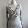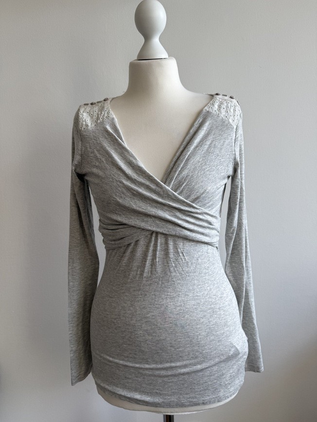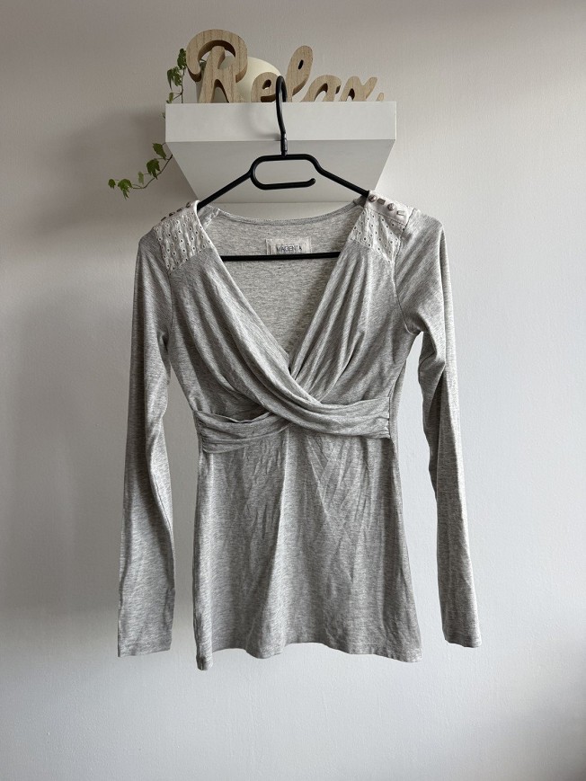 Szürke, hosszú ujjú Magenta felső nőies, átlapolt mellrésszel és karcsúsító szabással. Vállrészen finom csipkés/betétes díszítéssel, ami különlegessé teszi az összhatást.