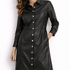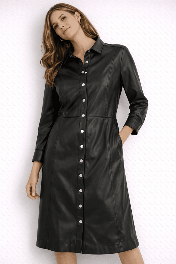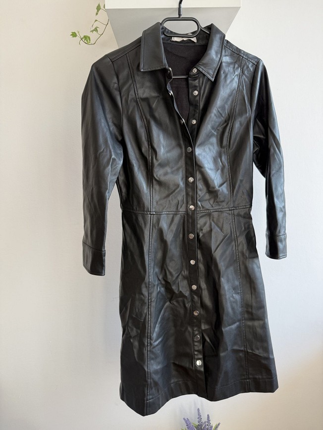 Stílusos, fekete műbőr ruha ingruha fazonban. Patentos gombolása és galléros kialakítása modern, karakteres megjelenést ad, miközben a karcsúsított szabás szépen követi az alakot.