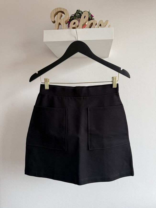 Letisztult, fekete színű Mango mini szoknya, elöl zsebes kialakítással, ami egyszerre praktikus és trendi.