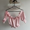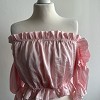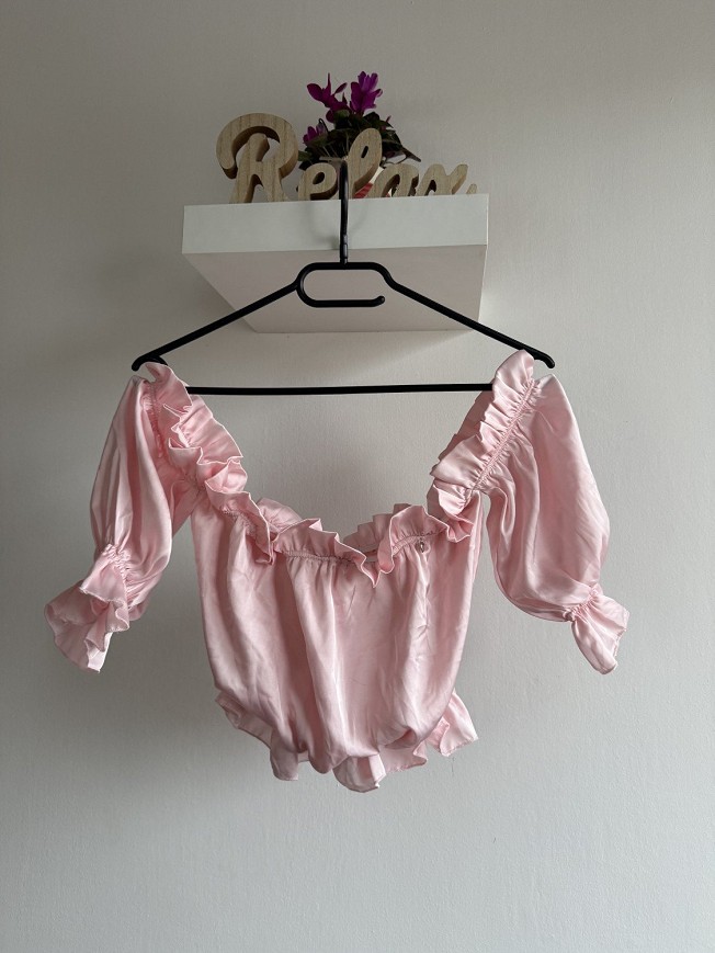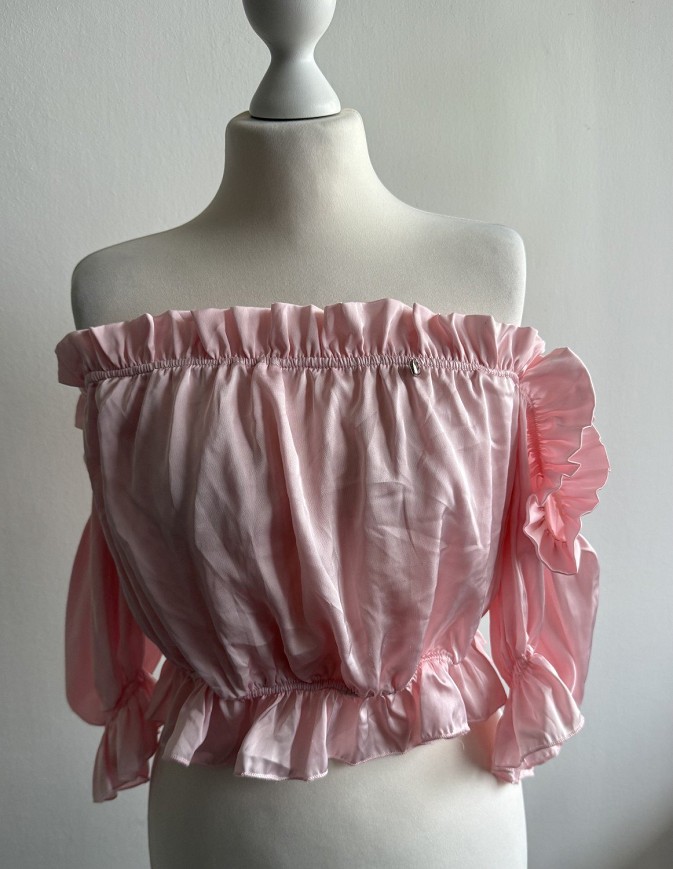 Romantikus hangulatú, világos rózsaszín Mayo Chix felső nőies fodrokkal és gumírozott vállrésszel.
