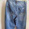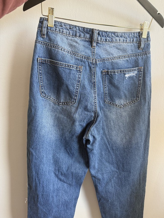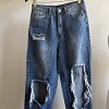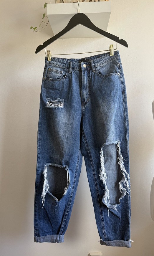 Középkék, lazább fazonú farmer, látványos, nagyobb szakításokkal az elején.