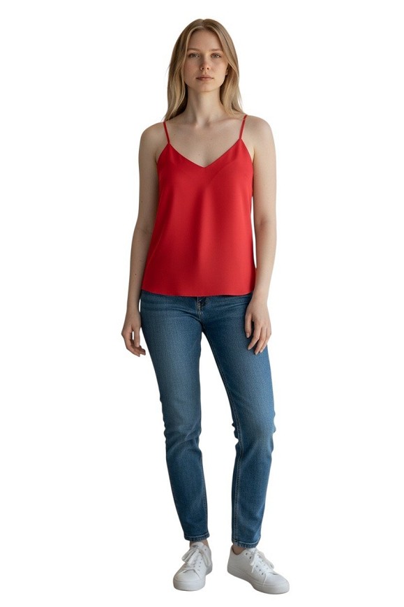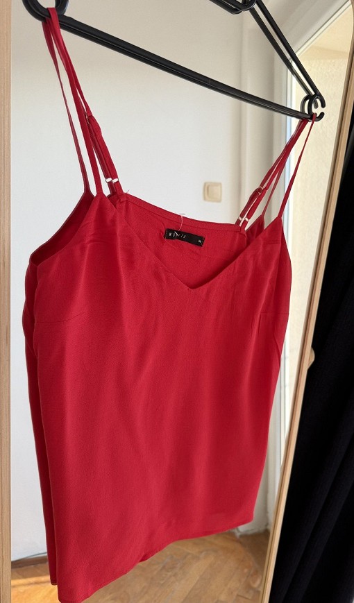 Elegáns, élénk piros top a Mohito márkától. A vékony, dupla pántos kialakítás és a V-kivágás nőies, letisztult megjelenést ad.
