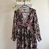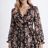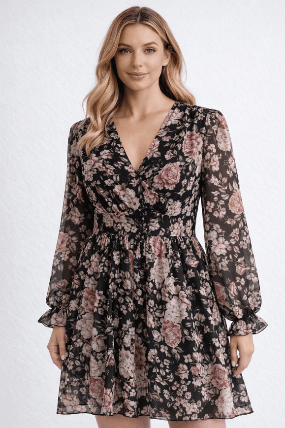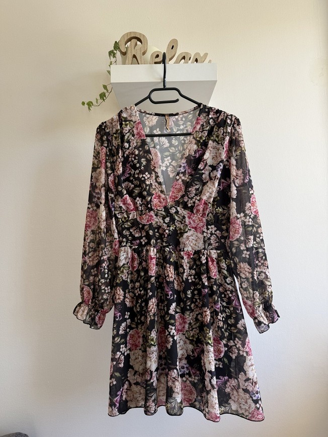 Virágmintás, könnyed esésű ruha, S/M-es méret. Fekete alapon rózsaszín–bézs virágmintás, enyhén áttetsző anyaggal. Mell alatt szabott, V-kivágású fazon, hosszú ujjakkal és gumírozott mandzsettával. Csinos, nőies darab, alkalomra és hétköznapra is tökéletes.