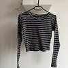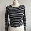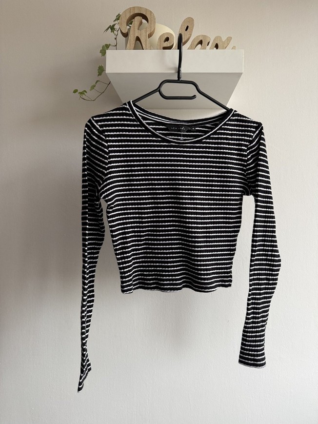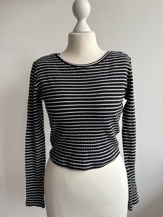 Fekete-fehér csíkos, hosszú ujjú, rövidebb fazonú női felső. Rugalmas, bordázott anyagának köszönhetően kényelmes viselet, szépen követi az alakot.