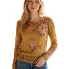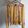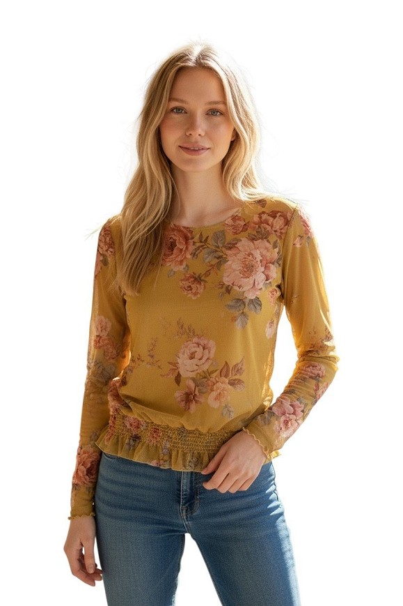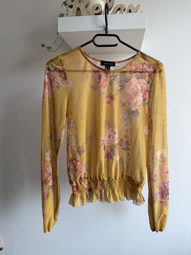 Sárga alapon romantikus virágmintás, könnyed, áttetsző anyagból készült felső. Dereka gumírozott, így szépen formálja az alakot, miközben kényelmes viselet marad. Farmerrel vagy magas derekú nadrággal igazán csinos, nőies szettet alkot.